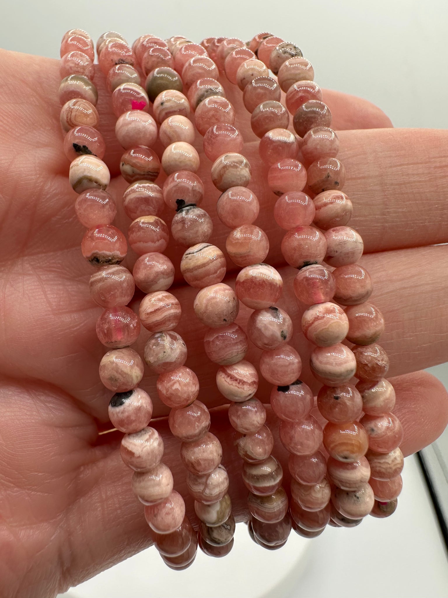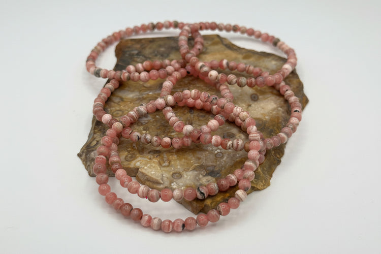 Embrace the gentle energy of rhodochrosite with this elegant stretch bracelet. Featuring smooth, polished beads measuring 4-4.5mm, this 7.5" bracelet fits comfortably on most wrists without clasps or fasteners. Known for its soft pink hues and heart-healing properties, rhodochrosite is cherished by crystal enthusiasts for promoting emotional balance and self-love. The stretchy design makes it easy to slip on and off while maintaining durability for everyday wear. A beautiful addition to any gemstone collection or meaningful gift for someone special.