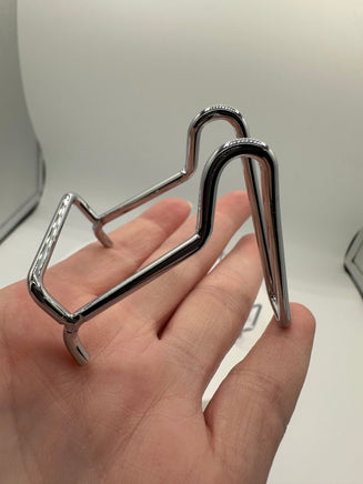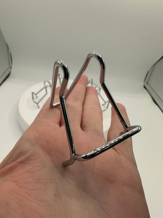 Featuring a clean metallic finish, the stand offers a modern, neutral look that complements any crystal or mineral without overpowering it. The structure cradles smaller pieces, allowing them to be displayed at an ideal viewing angle.