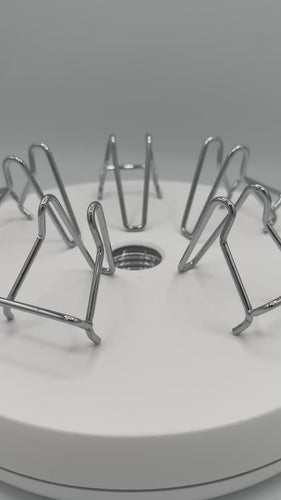 This silver mineral display stand is designed specifically for showcasing smaller crystal specimens with stability and style. Its compact size makes it ideal for holding mini clusters, small carvings, or mineral pieces while keeping the focus on the specimen itself.