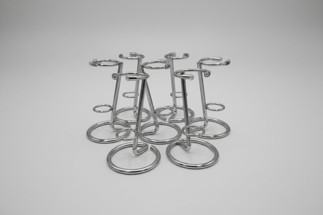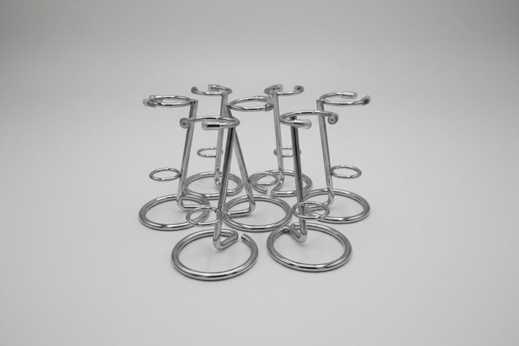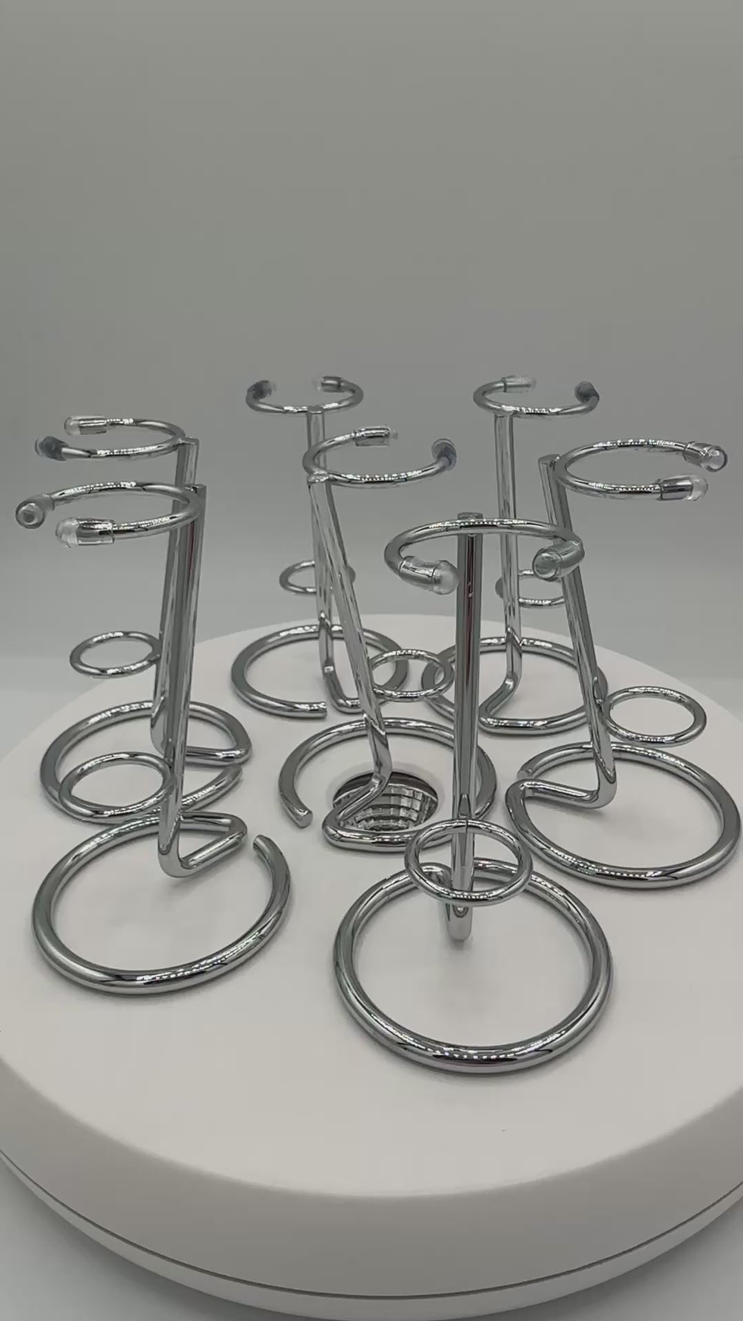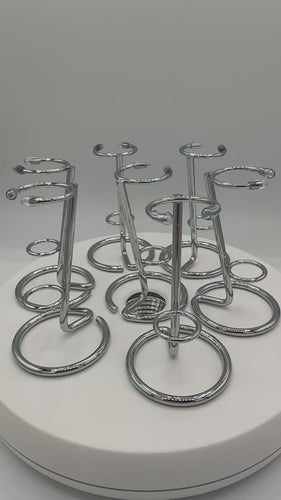 This sleek silver display stand is designed to securely hold and showcase crystal towers, wands, and other upright specimens. Featuring a clean metallic finish, the stand provides a modern and minimal look that complements a wide variety of stones without distracting from their natural beauty.