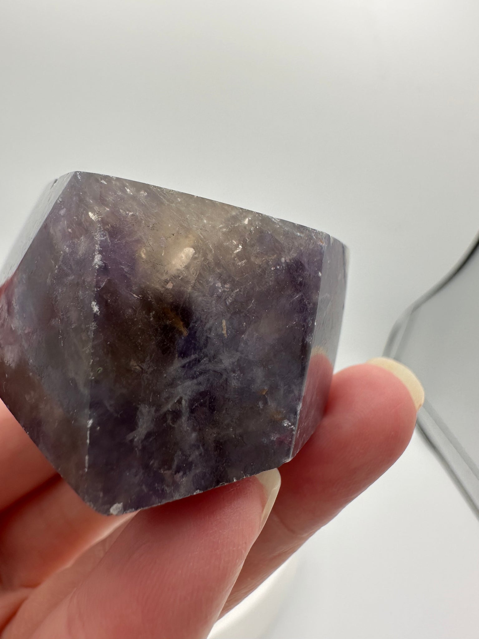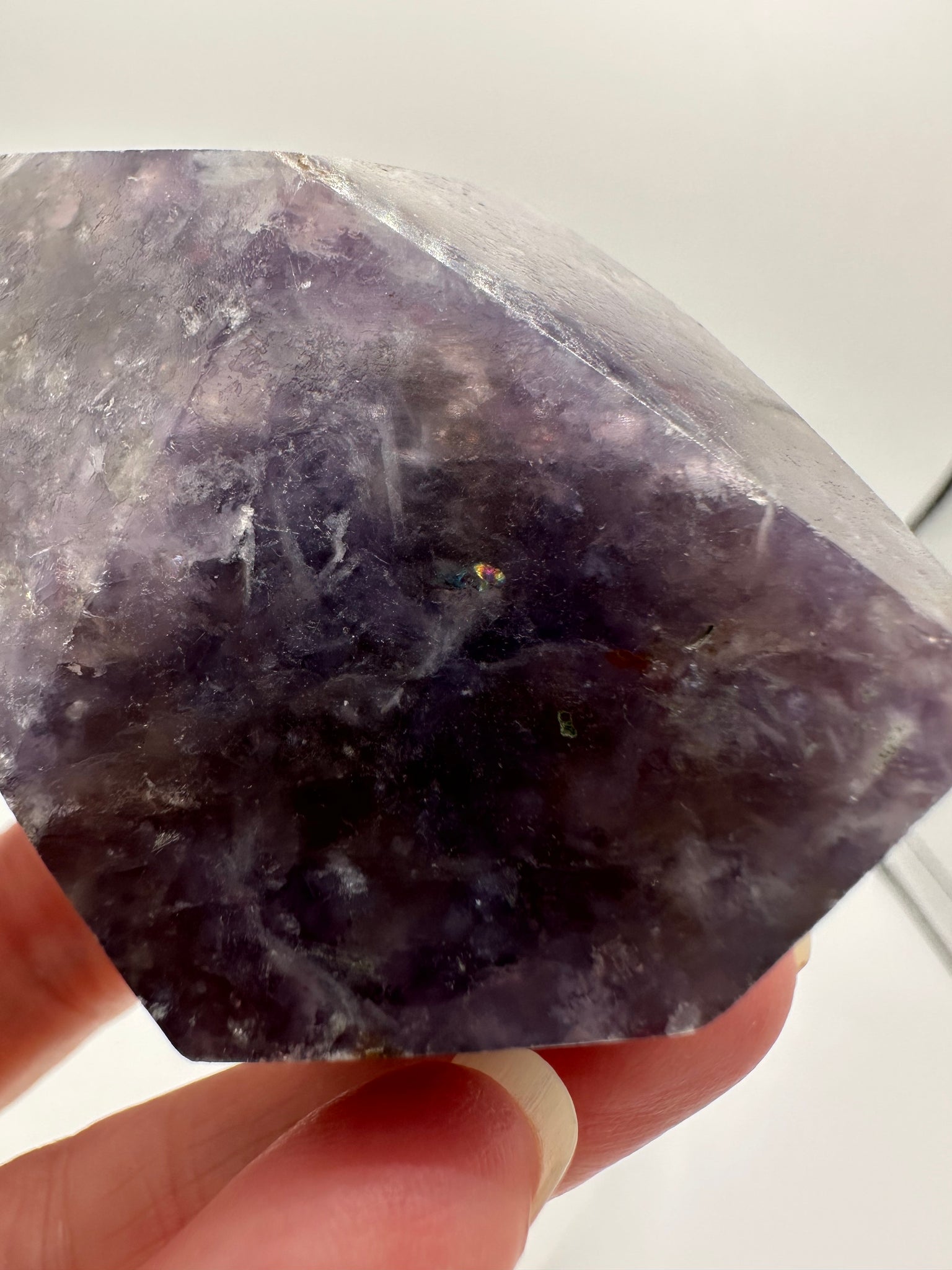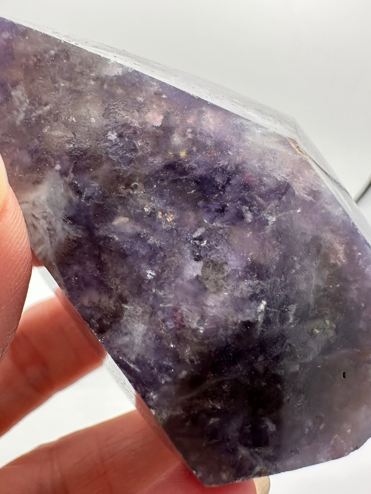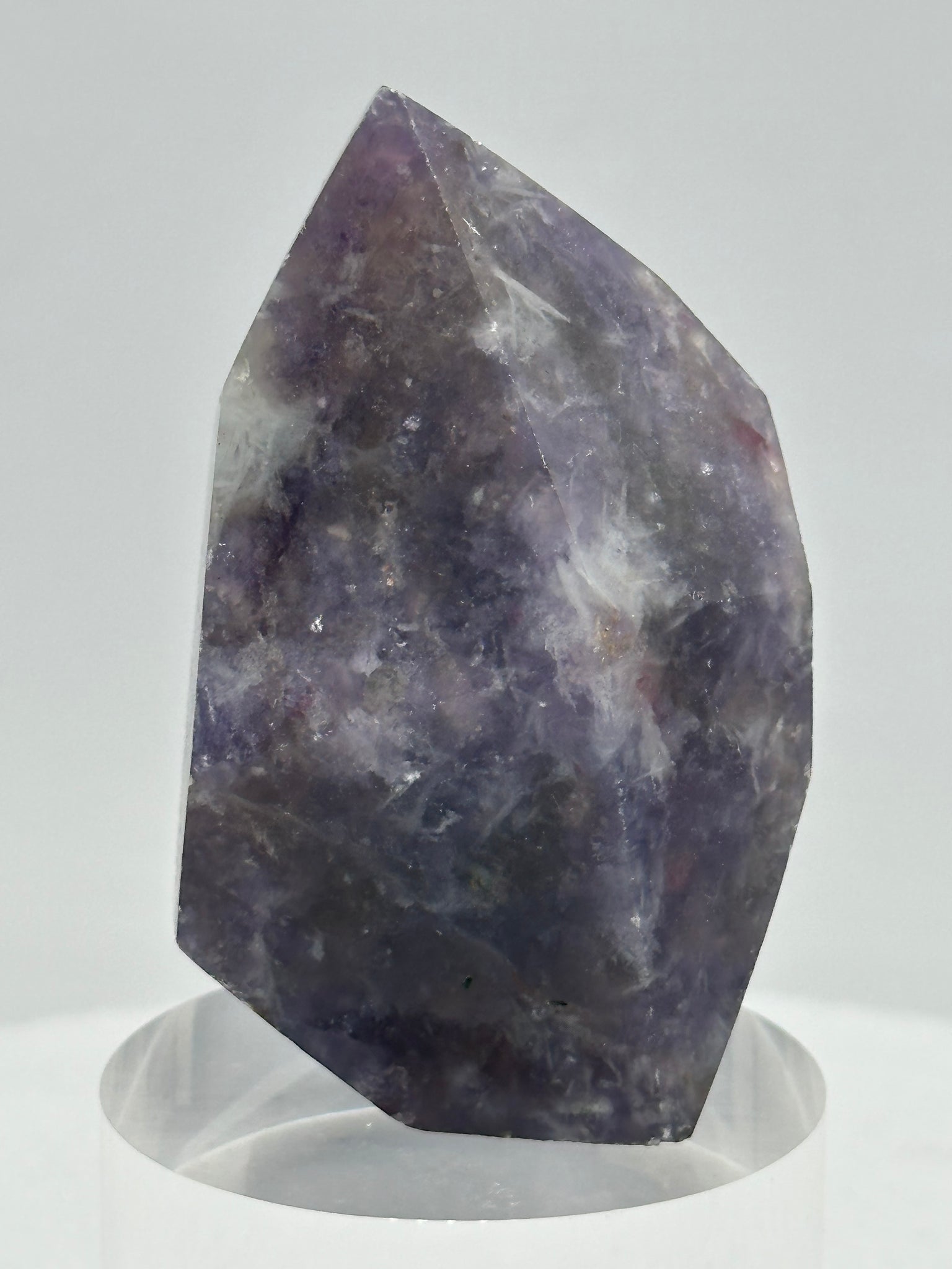 - Subtle mica shimmer from lepidolite