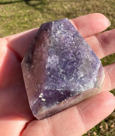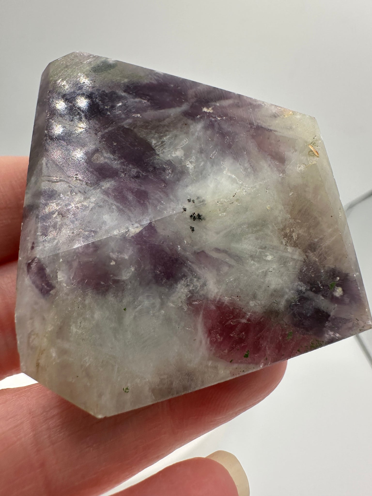 This stunning Unicorn Stone freeform is a polished piece composed of a natural blend of Lepidolite, Pink Tourmaline, Smoky Quartz, and Cleavelandite. The material features a soothing yet dynamic palette of lavender, soft pink, smoky gray, and creamy white tones, often accented by a gentle shimmer from mica-rich lepidolite.